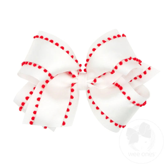 Medium Holiday Style Pom-Pom Edge Grosgrain Overlay Girls Hair Bow