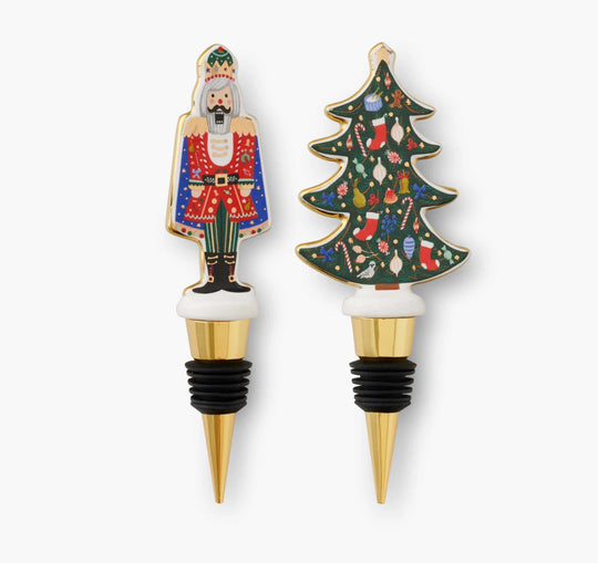 A pretty pair of porcelain wine stoppers, in the shape of a nutcracker and a Christmas tree with illustrated artwork and gold foil accents.Regular price $28.00 -