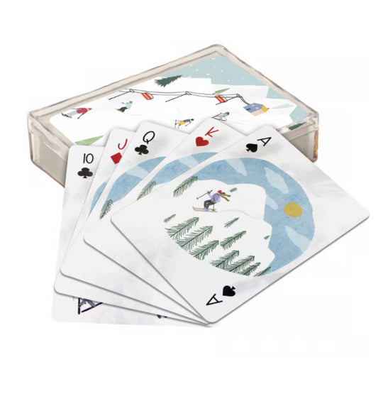 A 54-card playing deck displaying hand illustrated designs of skiers having fun on mountain slopes for each card. Our Skiing Fun playing cards are packaged in a protective acrylic case for easy storage when not in...Regular price $8.00