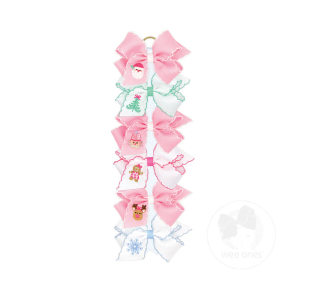 Assorted Medium Grosgrain Hair Bows with Moonstitch Edge and Pink Christmas Embroidery