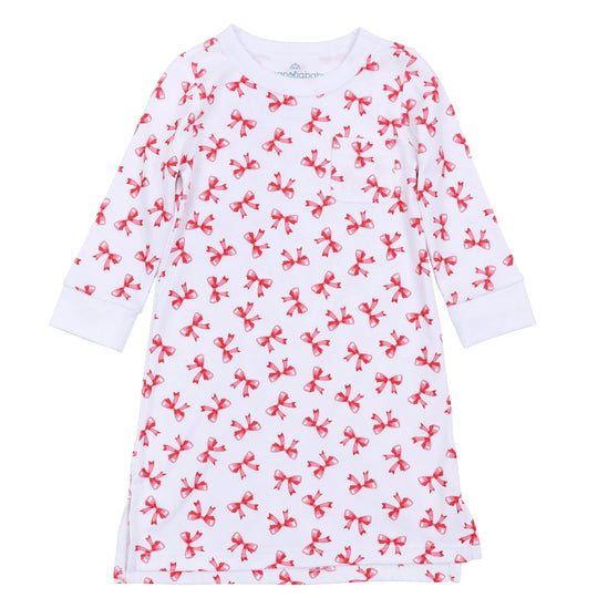 This adorable nightdress, crafted from luxurious white Pima Cotton, features all-over bows print and delicate ruffles, adding a touch of timeless elegance. The long, loose style and red picot trim make it perfect for comfortable, peaceful...Regular price $39.00 -