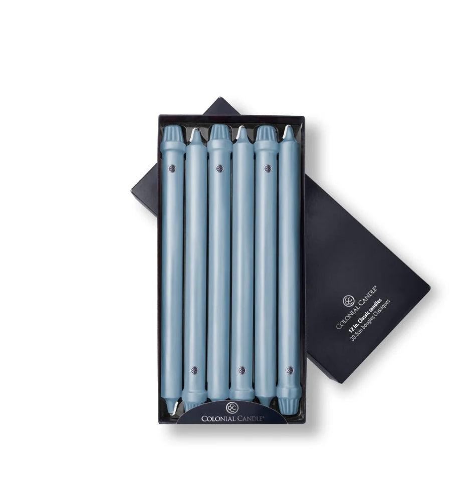 A soothing neutral color, this unscented Coastal Blue taper candles bring a breath of fresh air to your home décor. These twelve-inch candles have a bevelledbase to provide stability and support needed for most taper holders, are virtually drip free, and have a burn time of up to ten hours each.