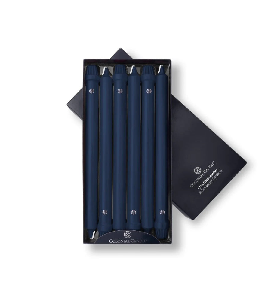 A boldly elegant color, the unscented Indigo taper candles bring a dynamic look to your home décor. These twelve-inch candles have a bevelledbase to provide stability and support needed for most taper holders, are virtually drip free, and have a burn time of up to ten hours each.