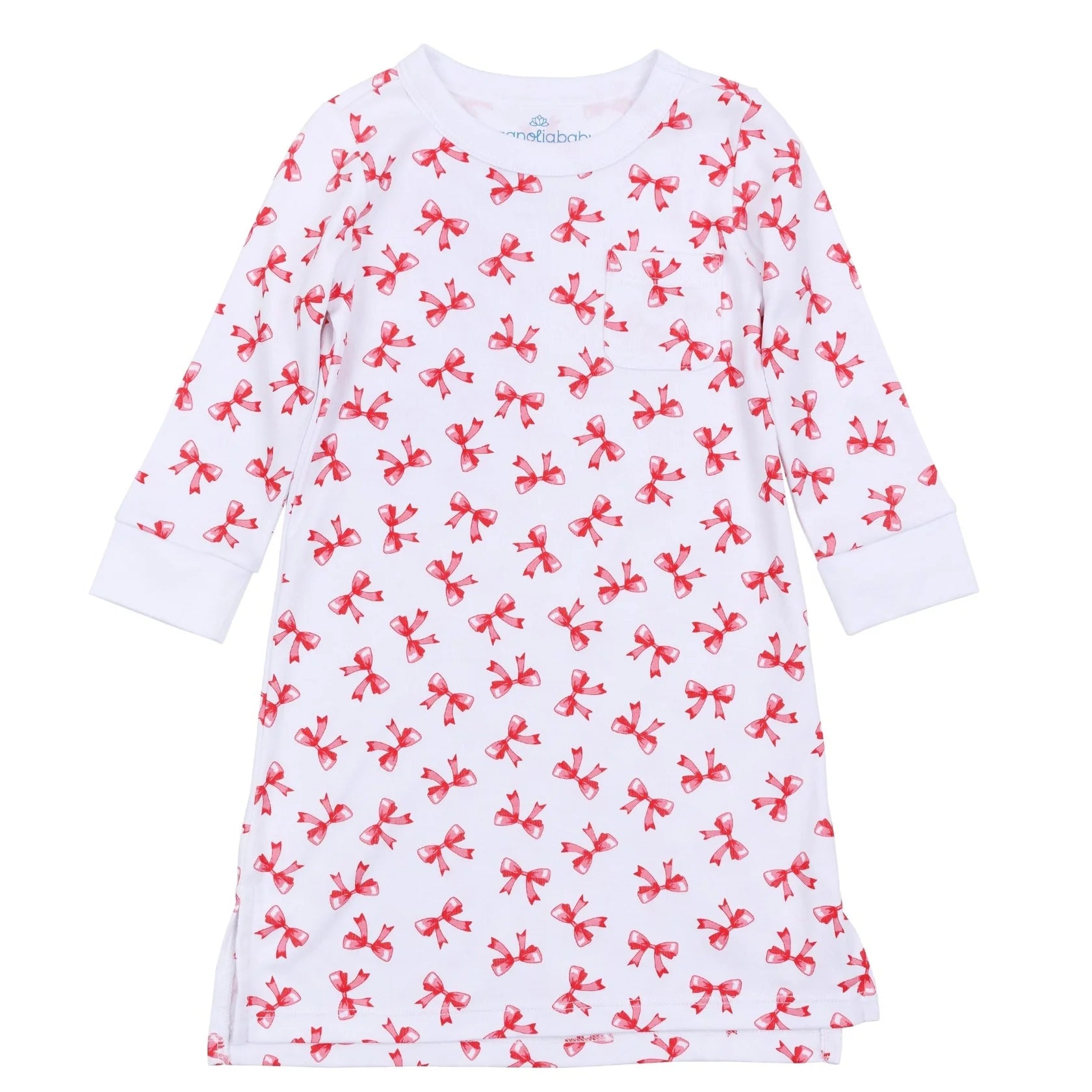 This adorable nightdress, crafted from luxurious white Pima Cotton, features all-over bows print and delicate ruffles, adding a touch of timeless elegance. The long, loose style and red picot trim make it perfect for comfortable, peaceful sleep.