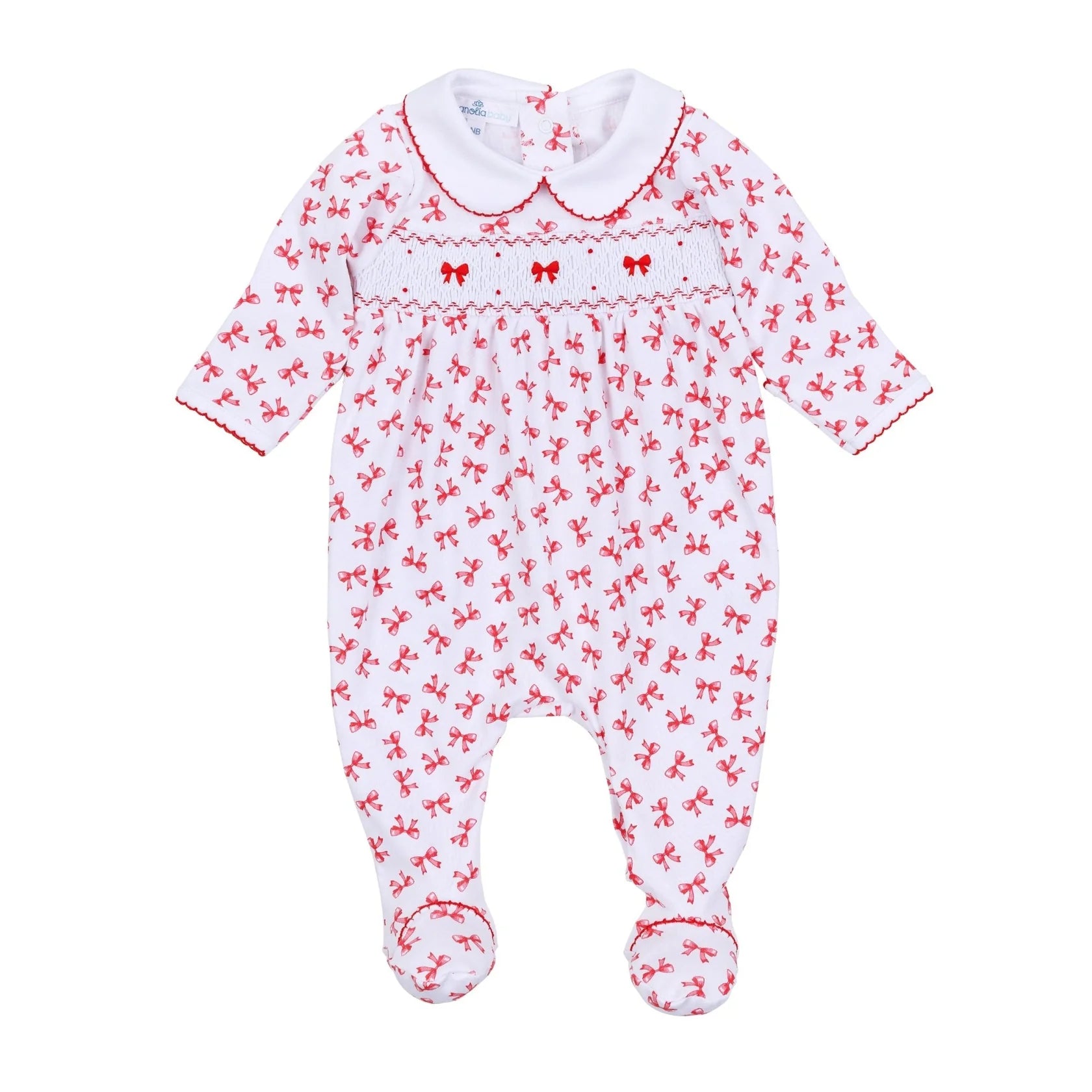 This delightful footie, made from luxurious Pima Cotton, is a perfect blend of classic style and comfort. It features a charming all-over bows print and a delicate smocked detail at the chest, finished with red picot trim on the collar and cuffs.