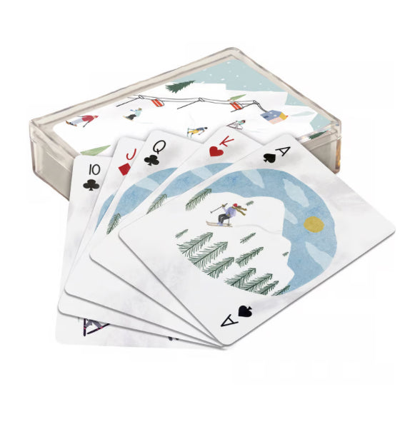 A 54-card playing deck displaying hand illustrated designs of skiers having fun on mountain slopes for each card. Our Skiing Fun playing cards are packaged in a protective acrylic case for easy storage when not in use or traveling. A fun ski-themed gift perfect for on the go games.