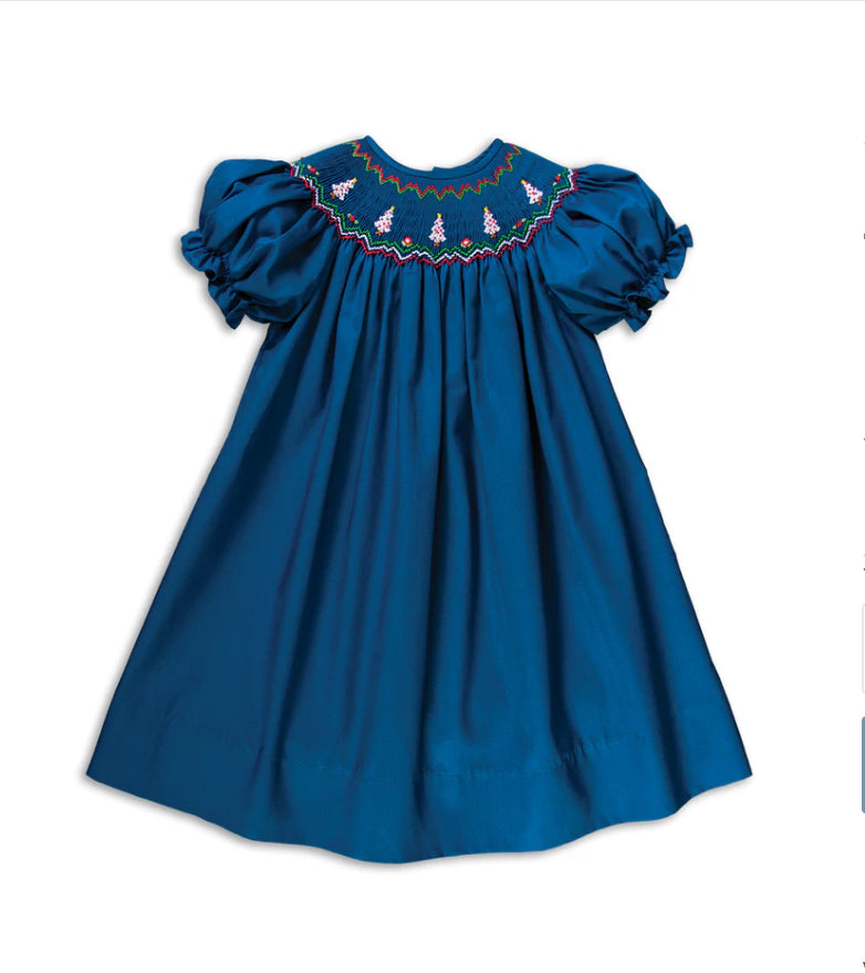 Royal blue smocked bishop. Smocked with white and red Christmas trees. Puff sleeves and buttons in back.